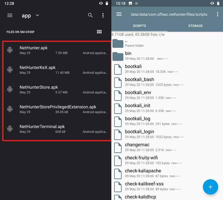 Root Explorer같은 탐색기를 이용하여 /data/data/com.offsec.nethunter/files/scripts 경로의 파일들을 /system/bin로 전부 복사해준다.