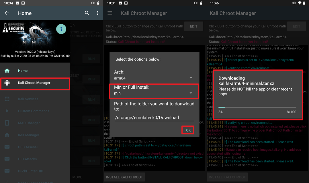 Nethunter앱을 실행하여Kali Chroot Manager메뉴에서Minimal Chroot를 Install한다.